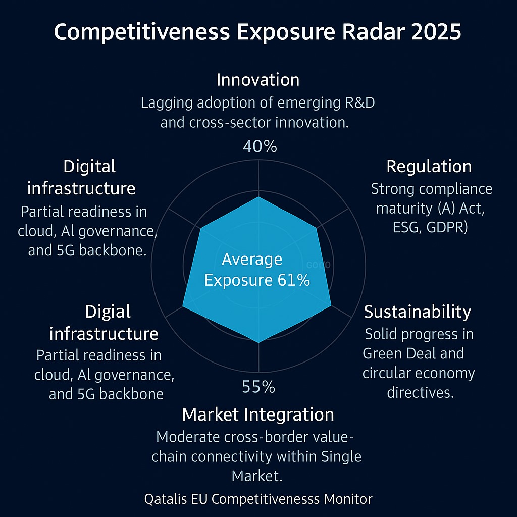 - Competitiveness Exposure Radar → immediate visibility into all risk domains (Innovation, Digital Infrastructure, Regulation, Sustainability, Market Integration)
